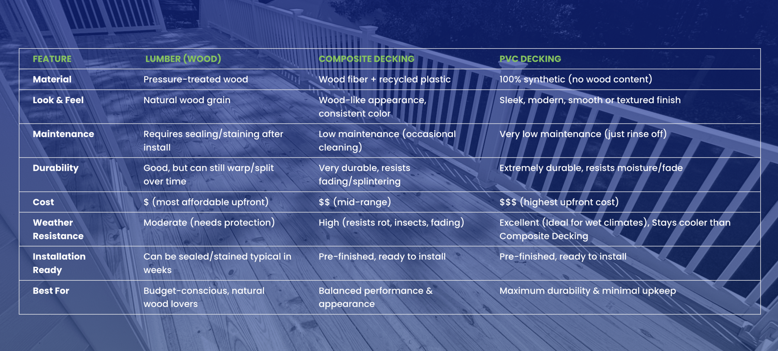 | FEATURE | LUMBER (WOOD) | COMPOSITE DECKING | PVC DECKING |